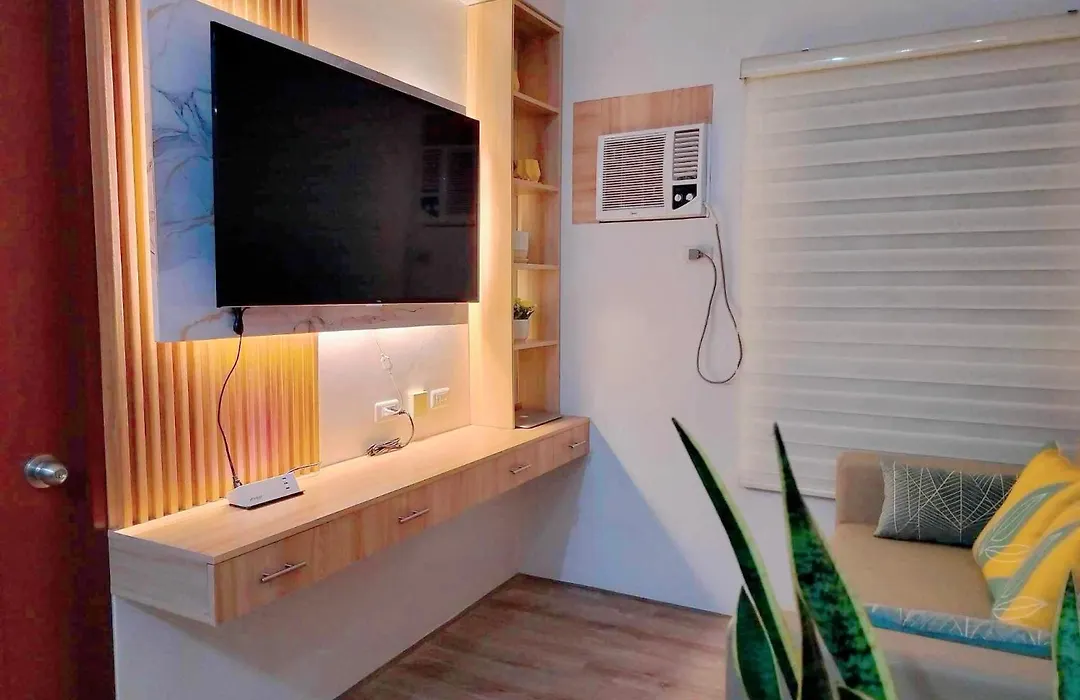 טלוויזיה עם מסך שטוח וערוצי לוויין ובקרת אקלים מסופקים בכל החדרים של Cozy Suites Bacolod Onebedroomsuite For Fourpax.